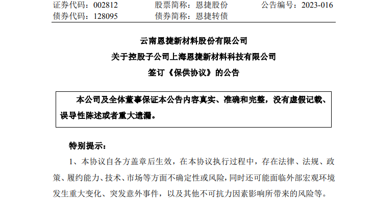 2月13日晚,恩捷股份(002812)公告,子公司上海恩捷日前与宁德时代签订2023年度《保供协议》,供应协议约定数量的锂电池湿法隔膜。