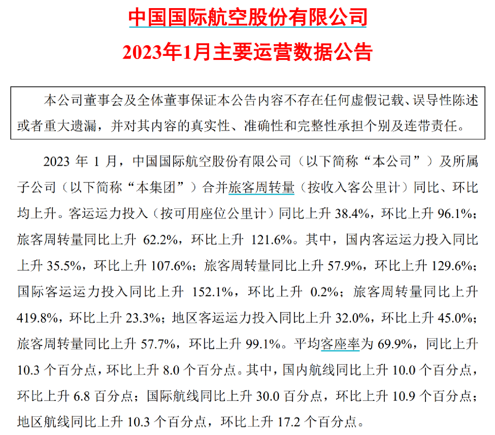 中国国航数据显示,该公司1月客运运力投入(按可用座位公里计)同比上升38.4%,环比上升96.1%,其中,国内客运运力投入同比上升35.5%,环比上升107.6%;国际客运运力投入同比上升152.1%,环比上升0.2%。