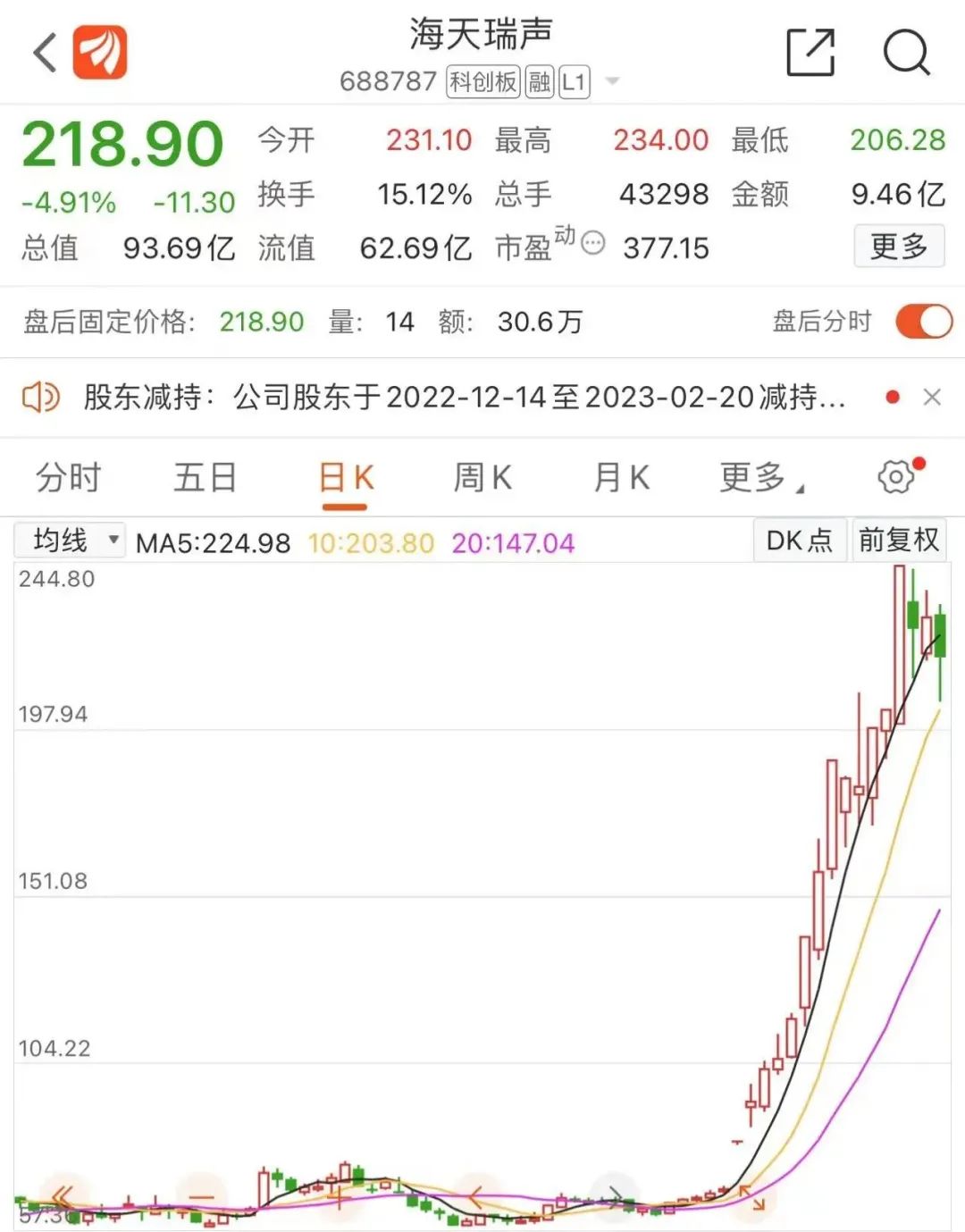 海天瑞声遭遇密集减持的一大背景是,1月30日至2月15日的13个交易日中,海天瑞声股价大涨了260%,总市值从29亿元飙升至105亿元。而近3个交易日,该公司股价依旧维持高位震荡,最新股价报218.90亿元/股,市值近94亿元。