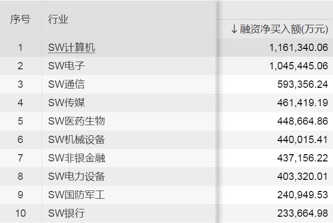从行业情况来看,2月19日-3月1日,申万一级行业融资余额均有增加,计算机、电子、通信行业融资余额增加金额居前,分别增加116.13亿元、104.54亿元、59.34亿元;美容护理、综合、纺织服饰行业融资净买入金额较少,均获净买入超1亿元。