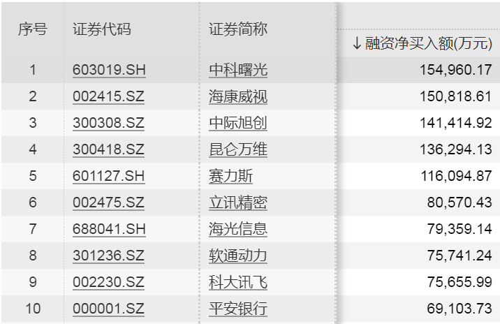 从个股情况来看,融资客加仓居前的5只股票分别为中科曙光、海康威视、中际旭创、昆仑万维、赛力斯,分别获净买入15.50亿元、15.08亿元、14.14亿元、13.63亿元、11.61亿元。
