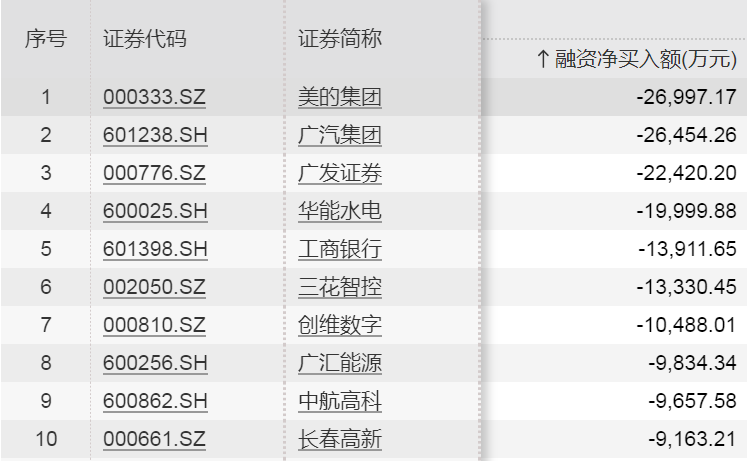 融资客减仓居前的5只股票分别为美的集团、广汽集团、广发证券、华能水电、工商银行,分别净卖出2.70亿元、2.65亿元、2.24亿元、2.00亿元、1.39亿元。