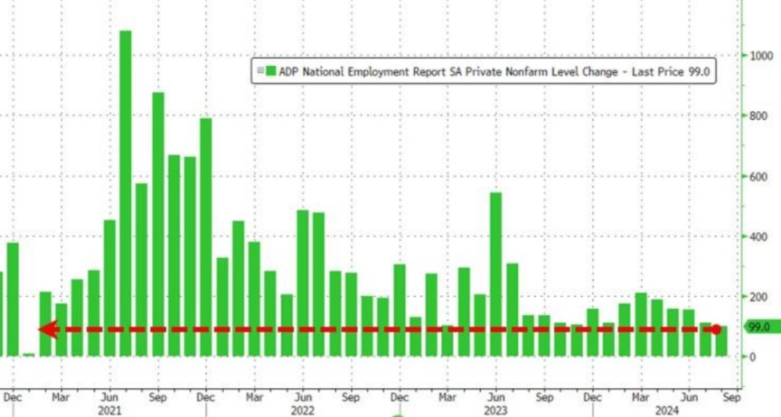 北京时间9月5日晚间,美国ADP Research Institute与斯坦福数字经济实验室合作发布的数据显示,美国8月ADP就业人数增长9.9万人,创2023年10月以来最低纪录,大幅不及预期的14.5万人,前值由增加12.2万人修正为11.1万人。